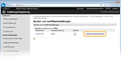 Klicka på [Registrera standardnyckel] till höger om det nyckelpar som du vill använda.