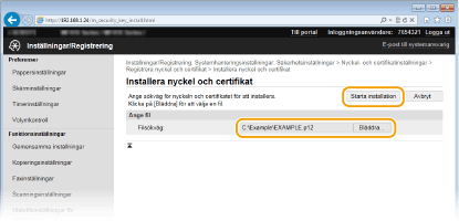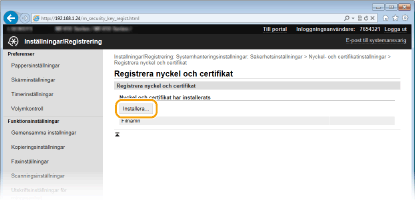 Klicka [Nyckel- och certifikatinställningar] för att installera nyckelpar eller [CA-certifikatinställningar] installera ett CA certifikat.