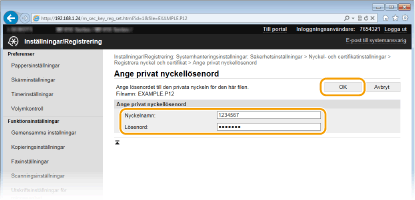 Ange namnet på nyckelparet och lösenord och klicka sedan på [OK].