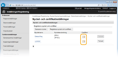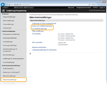 Klicka på [Nyckel- och certifikatinställningar] om du vill verifiera ett nyckelpar och på [CA-certifikatinställningar] om du vill verifiera ett CA-certifikat.