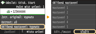 Pokud chcete upravit nebo vymazat uložené nastavení, přejděte na <Fax>  <Oblíbená nastavení>  <Edit./Smazat>  <Editovat> nebo <Smazat> a pak postupujte podle níže uvedených kroků.