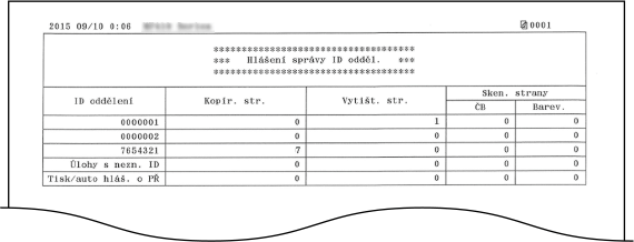 Pokud je povolena správa ID oddělení, můžete vytisknout hlášení správy ID oddělení a zkontrolovat celkový počet výtisků pro jednotlivé organizační jednotky (<ID oddělení>). Informace o celkovém počtu výtisků pomáhají zlepšit správu zásob papíru a tonerů.