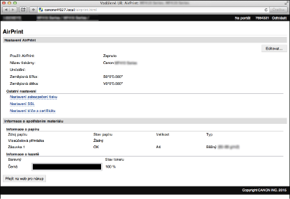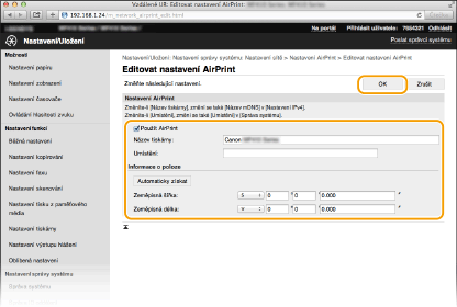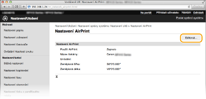 Můžete zaregistrovat údaje, včetně názvu zařízení a instalačního umístění, pomocí nichž lze zařízení identifikovat. Můžete také deaktivovat službu AirPrint zařízení. Tato nastavení lze změnit pomocí Vzdáleného uživatelského rozhraní.