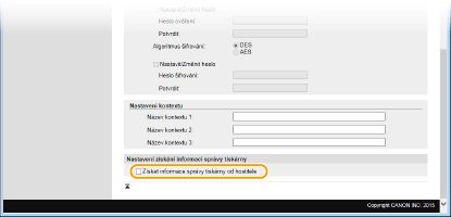 Zadejte nastavení Získávání informací o správě tiskárny.