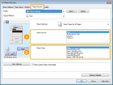 Zdroj papíru bude automaticky vybrán podle zadané velikosti a typu papíru pro tisk a nastavení provedeného v zařízení.