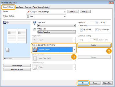 Vyberte možnost [Booklet Printing] (Tisk brožury) v nabídce[1-sided/2-sided/Booklet Printing] (1stranný tisk / oboustranný tisk / tisk brožury)
