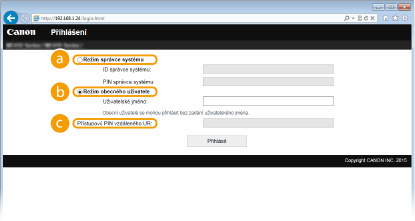 Prostřednictvím uživatelského rozhraní můžete provádět všechny operace a nastavení. Pokud je specifikováno ID správce systému, zadejte příslušné ID do pole [ID správce systému] a příslušný kód PIN do pole [PIN správce systému].