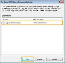 Chcete-li toto zařízení používat jako skener, je třeba provést přípravné kroky, včetně instalace softwaru do počítače. Další informace naleznete v dokumentu „MF Driver Installation Guide (Příručka instalace ovladače MF)“. Chcete-li zařízení připojit k vašemu počítači přes bezdrátovou nebo pevnou síť LAN, musíte zařízení registrovat v nástroji „MF Network Scanner Selector“ podle níže uvedeného postupu. Tento postup se nevyžaduje, když je zařízení i počítač připojeno přes USB.