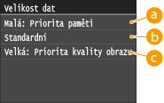 Můžete zadat poměr komprese souborů, když jsou naskenované dokumenty převedeny do formát JPEG. <Malá: Priorita paměti> zvýší kompresní poměr oproti normální hodnotě, aby se vytvořily menší soubory s nižší kvalitou obrazu. Volba <Velká: Priorita kvality obrazu> na druhé straně snižuje poměr komprese oproti normální hodnotě, díky tomu jsou vytvořené soubory větší, ale s vyšší kvalitou obrazu.