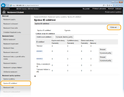[Celkem stran ID oddělení]Pro každé ID oddělení můžete zkontrolovat celkový počet zkopírovaných, vytištěných, naskenovaných nebo odfaxovaných stránek.