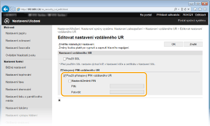 Zaškrtněte políčko [Použít přístupový PIN vzdáleného UR] a nastavte kód PIN.