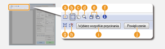 Służy do określania obszaru przycinania za pomocą ramki przycinania. Kliknij i przeciągnij, aby ustalić obszar przycinania. Obszar przycinania jest oznaczony kropkowaną linią. Ramkę przycinania można przesuwać i zmieniać jej rozmiar za pomocą myszy.