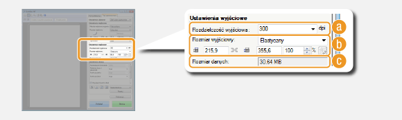 Wyświetlanie rozmiaru danych obrazu, gdy jest on skanowany ze skonfigurowanymi ustawieniami [Rozdzielczość wyjściowa] i [Rozmiar wyjściowy].