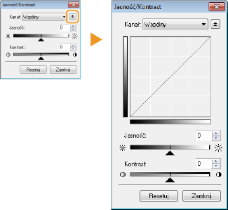 Regulacja jasności i kontrastu (różnicy między jasnymi i ciemnymi częściami) obrazu. Aby dostosować to ustawienie, jednocześnie kontrolując jego wartość na wykresie, należy kliknąć przycisk