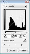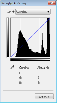 Efekty wszystkich regulacji: jasności, kontrastu (  ), histogramu (  ) oraz ustawienia krzywej tonowej (  ) są przedstawione w postaci krzywej tonowej oraz wartości liczbowych. Zalecane jest przeprowadzenie końcowego przeglądu ustawień kolorów.