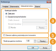 Dzięki określeniu wartości gamma monitora komputera dokument może być wyświetlany z prawidłowym ustawieniem jasności. To ustawienie jest stosowane, gdy dla ustawienia [Kolor] wybrano opcję [Skala szarości] lub [Tryb koloru].