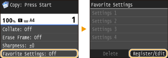 Можна реєструвати до чотирьох часто використовуваних комбінацій параметрів копіювання. За необхідності достатньо вибрати зареєстровану комбінацію параметрів, що дає змогу не вводити щоразу ті самі параметри для копіювання (наприклад, вказувати 5 копій), установлювати для параметра <Erase Frame> значення <On> та збільшувати різкість під час копіювання. Параметри також можна відобразити у вигляді кнопок ярликів на екрані Home.