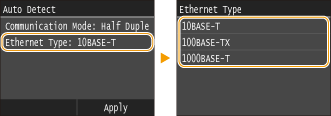 виберіть тип Ethernet.![]() ![]() Якщо для параметра <Communication Mode> вибрано значення <Half Duplex>, параметр <1000BASE-T> встановити не можна.
