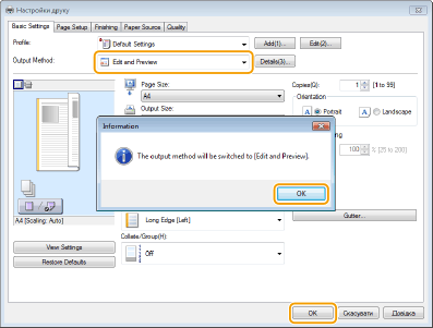 Виберіть елемент [Edit and Preview] (Редагування та попередній перегляд) у списку [Output Method] (Спосіб виведення).