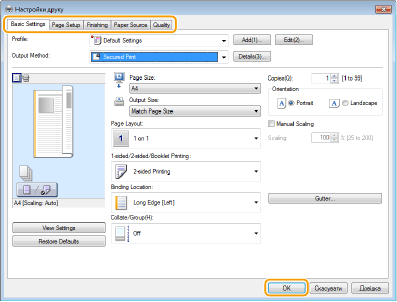 Натисніть селективну кнопку [Basic Settings] (Основні параметри), [Page Setup] (Настроювання сторінки), [Finishing] (Кінцева обробка), [Paper Source] (Джерело паперу) або [Quality] (Якість), щоб указати необхідні параметри друку на кожному екрані.