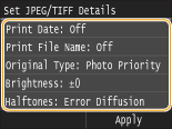 / налаштуйте яскравість, а потім торкніться кнопки <Apply>.<Параметр Brightness> недоступний для друку TIFF-файлів, для яких не використовується стискання JPEG.