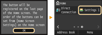 Якщо вибрати <Yes>, з’явиться повідомлення. Перегляньте його та торкніться кнопки <OK>. Комбінація зареєстрованих параметрів додається на екран Home як кнопка ярлика.