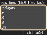 Ja iepriekš redzamais ekrāns netiek rādīts, ievietojot papīruJa daudzfunkciju papīrturī vienmēr ievietojat vienu un to pašu papīra formātu, varat izlaist papīra iestatīšanas darbības, reģistrējot papīra formātu un veidu kā noklusējuma iestatījumu. Reģistrējot noklusējuma iestatījumu, iepriekš redzamais ekrāns netiek parādīts. Lai parādītu ekrānu, izvēlieties<Norādīt, ievietojot papīru> (Noklusējuma papīra iestatījumu reģistrēšana daudzfunkciju papīrturim).