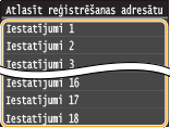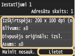 Varat reģistrēt līdz 18 bieži izmantotās faksa iestatījumu kombinācijas. Ja nepieciešams, varat ātri parādīt reģistrētos iestatījumus, tādēļ vairs nav nepieciešams pielāgot iestatījumus katru reizi, piemēram, izpildīt "divpusēja oriģināla skenējuma veidošanu, tā nosūtīšanu 5 adresātiem un asuma iestatīšanu". Iestatījumus varat parādīt arī kā īsinājumpogas ekrānā Sākums.