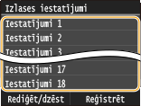Lai rediģētu vai dzēstu jau reģistrētus iestatījumus, atveriet <Fakss>  <Izlases iestatījumi>  <Rediģēt/dzēst>  <Rediģēt> vai <Dzēst> un pēc tam izpildiet tālāk aprakstītās darbības.