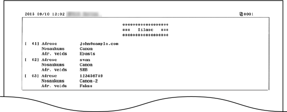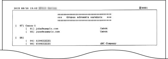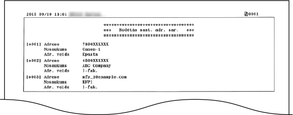 Izdrukājiet adrešu grāmatas sarakstu, lai pārbaudītu tos adresātus, kas adrešu grāmatā ir reģistrēti sadaļā <Kodētā numura sastādīšana>, <Izlase> un <Grupas nr. sast.>.