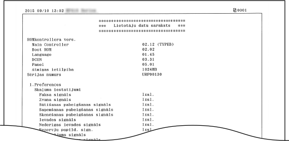 Opcijā <Lietotāju datu saraksts> nav iekļauti iestatījuma <Tīkla iestatījumi> un <Sistēmas pārvaldības iestatījumi> saraksti, un <Faksa iestatījumi> iestatījumu saraksta daļa. Lai pārbaudītu visus iestatījumu vienumus, ieskaitot <Tīkla iestatījumi> un <Sistēmas pārvaldības iestatījumi>, izdrukājiet <Sistēmas administratora datu saraksts>.