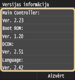 Varat pārbaudīt programmaparatūras versiju no iekārtas darbības paneļa. Pēc programmaparatūras atjaunināšanas beigām pārliecinieties, ka atjauninājums veikts pareizi. Programmaparatūras versijas pārbaudīšana