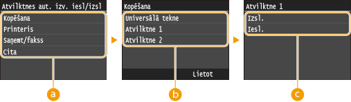 Iespējojiet vai atspējojiet papīra avotu automātiskās atvilktnes atlases funkciju. Ja dokumentu drukāšanas laikā automātiskā atvilktnes izvēle ir iestatīta kā <Iesl.>, iekārta automātiski izvēlas to papīra avotu, kurā ir ievietots atbilstošā formāta papīrs. Ja papīrs beidzas, šis iestatījums aktivizē nepārtrauktu drukāšanu, pārslēdzot no viena papīra avota uz citu avotu, kurā ir ievietots tāda paša formāta papīrs.