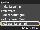 Visi kopēšanas iestatījumi ir ar īsu aprakstu. Noklusējuma iestatījumi ir atzīmēti ar krustiņu (
