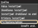 Visi pielāgošanas un uzturēšanas iestatījumi ir ar īsu aprakstu. Noklusējuma iestatījumi ir atzīmēti ar krustiņu (