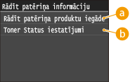 Ja nevēlaties izmantot tonera statusu, izvēlieties vērtību <Izsl.>. Lai tonera statusa sadaļā nerādītu pogu kas piekļūst vietnēm ar nolūku iegādāties tonera kasetnes, izvēlieties vērtību <Iesl.> un pēc tam izvēlieties <Izsl.>.