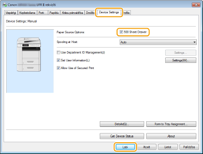 Atzīmējiet izvēles rūtiņu [500 Sheet Drawer] (500 lokšņu atvilktne)