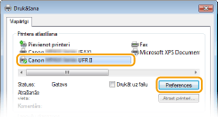 Izvēlieties šīs iekārtas printera draiveri un noklikšķiniet uz [Preferences] vai [Rekvizīti].