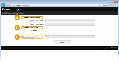 Varat veikt visas Remote UI (Attālais lietotāja interfeiss) darbības un izmantot visus iestatījumus. Ja ir norādīts sistēmas administratora ID, ievadiet atbilstošo ID šeit: [System Manager ID], bet atbilstošo PIN šeit: [System Manager PIN].