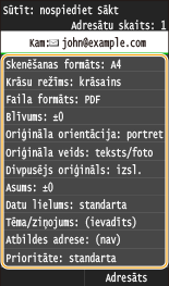 Lai rediģētu vai dzēstu jau reģistrētus iestatījumus, atveriet <Skenēšana>  <E-pasts>/<I-fakss>/<Fails>  <Izlases iestatījumi>  <Rediģēt/dzēst>  <Rediģēt> vai <Dzēst> un pēc tam izpildiet tālāk aprakstītās darbības.