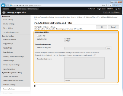Ja IP adreses ir ievadītas nepareizi, iekārtai, iespējams, nevarēsit piekļūt no Remote UI (Attālais lietotāja interfeiss); šādā gadījumā <IPv4 adrešu filtrs> vai <IPv6 adrešu filtrs> ir jāiestata kā <Izsl.>.