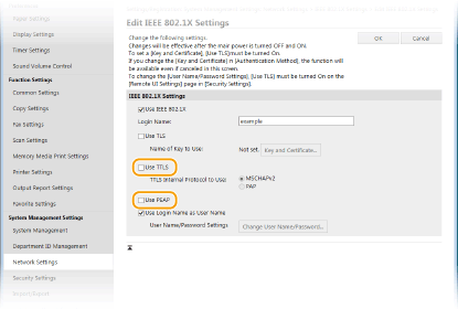 Nepieciešamie iestatījumi ir gandrīz tādi paši kā TTLS iestatījumi. MS-CHAPv2 tiek izmantots kā iekšējs protokols. Aktivizējiet utilītprogrammas Remote UI (Attālais lietotāja interfeiss) TLS pirms šīs autentifikācijas metodes konfigurēšanas (