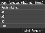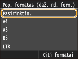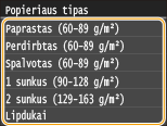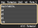 Jei įdėjus popieriaus anksčiau pavaizduotas ekranas nerodomasJeigu į daugiafunkcį dėklą visuomet dedate tokį patį popierių, popieriaus nustatymo veiksmus galite praleisti įregistravę popieriaus formatą ir tipą kaip numatytąjį parametrą. Įregistravus numatytąjį parametrą, anksčiau pavaizduotas ekranas nerodomas. Jei norite matyti ekraną, <Nurodykite, kada popierius įdedamas> pasirinkite (Daugiafunkcio dėklo numatytųjų popieriaus parametrų registravimas).