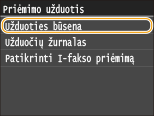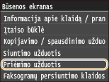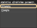 Jei norite spausdinti atmintyje saugomus gautus dokumentus, nustatykite <Atminties užrakinimo parametrai> reikšmę <Išjungta>. Spausdinami visi atmintyje esantys dokumentai.