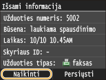 Galite patikrinti atmintyje saugomų dokumentų išsamią informaciją, įskaitant siuntėjų fakso numerius ir išsiųstų puslapių skaičių, tada panaikinti nereikalingus dokumentus.