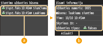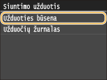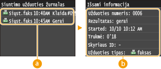 ![]() <Siuntimo užduoties žurnalas>/<Priėmimo užduoties žurnalas>Rodomas išsiųstų ir gautų dokumentų sąrašas. Kai dokumentas sėkmingai išsiunčiamas arba priimamas, rodoma <Gerai>, o kai dokumento nepavyksta išsiųsti ar priimti, nes jis buvo atšauktas arba įvyko kokia nors klaida, rodoma <Klaida>.