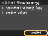 Prie aparato viduje esančių fiksavimo blokų gali prilipti nešvarumų, o dėl jų spaudiniuose gali atsirasti juodų ruožų. Norėdami išvalyti fiksavimo bloką, atlikite toliau nurodytus veiksmus. Atkreipkite dėmesį, kad fiksavimo bloko negalėsite valyti, kol bus laukiančių spausdinimo dokumentų. Norint išvalyti fiksavimo bloką, prireiks A4 arba „Letter“ formato paprasto popieriaus. Prieš atlikdami toliau aprašytus veiksmus, įdėkite popierių į popieriaus stalčių ar daugiafunkcį dėklą.