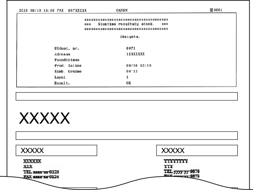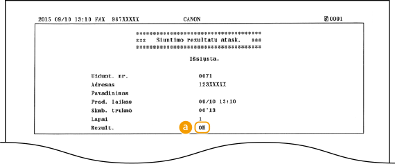 Išspausdinę siuntimo rezultatų ataskaitą, galite tikrinti išsiųstų dokumentų faksogramų ar el. laiškų / internetinių faksogramų, taip pat dokumentų, nuskaitytų į bendrai naudojamą aplanką arba FTP serverį, žurnalus. Ataskaitą galima spausdinti kiekvienąkart baigus perdavimą arba tik įvykus siuntimo klaidai.