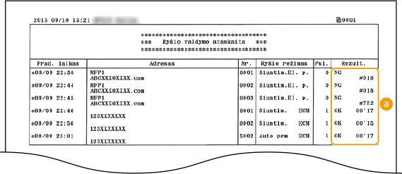 Kai rodomas klaidos kodas). Kai naudojami el. laiškai, Komunikacijos valdymo ataskaita nurodo rezultatą perdavimo iš aparato į pašto serverį, o ne iš aparato į paskirties adresą.