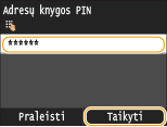 Jei adresų knygelei buvo nustatytas PIN, <Adresų knygos PIN> ekranas rodomas eksportavimo metu. Įveskite adresų knygelės PIN ir bakstelėkite <Taikyti>. Bakstelėkite <Praleisti> adresų knygelės duomenų eksportavimui atšaukti.
